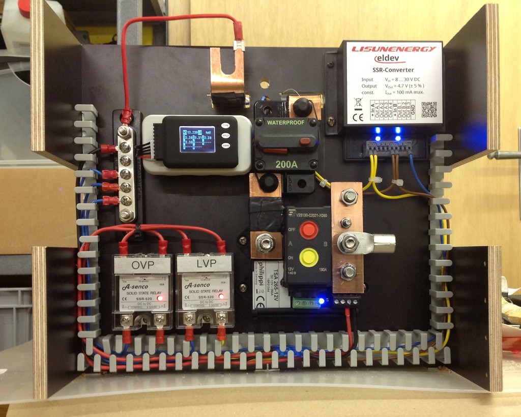 Hallo Ernst, das mit dem Preis ist einer der Gründe,warum hier Einige selbst bauen. Und Gebastel.... Wenn ich mir die Sets von Nothnagel angucke ist das wie Ikea Möbel, musst halt selbst schrauben, aber alles fertig dabei. Acki das verstehe ich nicht, bei mir blebt der Meßshunt kalt, irgendwas muss da faul sein. Alf finde ich klasse das du auf Sicherungen verzichtest :lol: endlich mal ein Mann mit Mut. Lieben Gruß Cornel Hallo Frank, hallo Sonnentau, zur Information: Ich habe einen Charisma 2 / Iveco Daily und da ist der Zwischenboden 33 cm hoch. Die Lipros hätten gerade noch auf die Pole gepasst, aber es wäre alles sehr eng geworden. Zur Akkukapazität: Unter Berücksichtigung meiner bisherigen Verbrauchsgewohnheiten erschienen mir 260AH ausreichend, außerdem waren diese Zellen als einzige sofort lieferbar. Den 200A Sicherungsautomaten werde ich im Auge behalten und die Wärmeentwicklung unter Belastung prüfen. Da der Wechselrichter nur 1500W leistet und die höchste bisher abgerufene Stromstärke unter 100A lag, habe ich noch keine auffällige Wärmeentwicklung beobachten können. Aber ich werden ggf. die Sicherung auswechseln, um auf der sicheren Seite zu stehen. Danke für die Anregungen! Liebe Grüße Dietmar Hallo, nach längerer Überlegung habe ich nun auch meine 2 Stück 95Ah AGM Batterien in meinem Hymer Wohnmobil gegen 160A Winston Akkus getauscht. Als Balancer habe ich das Litrade System und ein bistabiles Relais mit 260A Schaltstrom verwendet. Ich habe die Anlage so einfach wie möglich aufgebaut und kann den Block jetzt Eins zu eins gegen die originalen Batterien tauschen... auf der rechten Seite bei Batterie Minus wird noch der 200A Shunt meines Büttner Batteriecomputers geschraubt.... Der Testlauf hat schon mal einwandfrei funktioniert.... anbei ein paar Bilder meines bescheidenen Aufbaus, die ja bekanntlich mehr sagen als 1000 Worte lg Markus Moderation:Bilder eingefügt. Mantishrimp ![]() ![]() ![]() ![]() Hallo Markus, schön gemacht. Erinnert mich etwas an meine Ausführung. Leider gab es damals das 260A Relais für Gleichstrom noch nicht. Kannst Du mal ein Schaltbild einstellen, wie das Relais über OVP und UVP angeschlossen ist. Hatte mir schon überlegt das neue Relais nachzurüsten. Meine Akkus sind nach 1,5 Jahren mit dem V3 immer noch auf zwei Kommastellen gleich. Hallo, habe jeweils du UVP und OVP Plus zusammen gehängt und diese auch beim Relais an beide Plus gehängt.. dann habe ich UVP und OVP ON zusammengehängt sowie UVP und OVP OFF zusammengehängt und diese zusammen an das Relais gehängt habe bei den 4 Leitungen je eine Diode zwischengehängt.. komischerweise muss man die OVP bzw UVP OFF beim Relaiseingang auf ON, und OVP bzw UVP ON beim Relaiseingang OFF anhängen dann stimmts und das Relais wird richtig geschalten.... lg Markus Schön umgesetzt ! EIN KLEINER Tipp bei der Befestigung des Relais an der Holzkiste. Die Relais können manchmal sehr warm werden und die Wärme oder Hitze wird auf das Holz geleitet. Ich würde Dir empfehlen Isolierstützen darunter zu bauen. --> Link . Weist Du wie hoch der Schaltstrom des Relais ist ? Ich finde es nicht. Hallo Markus, danke für die Info. Hast Du den Anschlussplan von Litrade bekommen oder selbst ausgeklügelt? Hallo Sonnentau, das Relais ist auf der HP von Litrade beim V3 zu finden. Hi Jack, da ist alles selbst ausgeklügelt...aber da ich selber nicht wirklich sattelfest bin in diesen Dingen, hat mir ein Freund den Tip mit den Dioden gegeben ach übrigens für die Elektronik werde ich mich jetzt noch nach ner passenden Box umsehen damit sie schön geschützt ist :-) lg Markus PS: mal schauen wie es jetzt im Womo funktioniert :-) sodala, jetzt ist sie wirklich einbaufertig, habe noch ein Gehäuse von Conrad gekauft wo ich die Platine eingebaut habe :-) ![]() ![]() lg Markus Kannst du mal die E Nummer von Conrad einstellen? Hallo Markus, sieht schick aus. Wie kommst Du jetzt an die Prüftasten drann? Hallo, also wenn ich will komme ich schon noch ran an die Tasten seitlich, ausserdem könnte ich auch noch ein Loch bohren in die Abdeckung... aber ich denke das wird nicht nötig sein... Habe leider die Folie schon entsorgt wo die Nummer drauf gestanden hat lg Markus Wie schaltet denn das Relais wieder zurück,wenn uvp ausgelöst hat. ? Hallo Zusammen. Fast 2 Monate sind es schon wieder her seit meinem letzten Bericht und das Projekt " Winston Block " ist in der Endphase ,Inkl. 2x Praxistests. Eigentlich ziemlich verückt von mir, Erstes Wohnmobil gebraucht, gekauft um kleines Geld. 2 Reisen unternommen, DK und HR. es Gab uns jedoch eine Schönen Überblick was wir wollen und brauchen. Mit Bleibatterien ! nicht gerade das Gelbe vom EI. Muß allerdings gestehen vor dem Kauf des WOMO bereits als Gast hier mitgelesen zu haben. Dezember 15 dann erste Kontaktaufnahme nach dem Motto: WIE - WAS -WARUM und Weshalb nicht. Herausgekommen ist: neues Trennrelais, 260 oder 300 Winstonzellen, Protect V3.1 12V. WR über serienmässige EInschalter anzukuppeln um billige Relais zu verwenden . Bei der Suche nach lieferbaren Winstonzellen über Angebot der Fa. Nothnagel gestolpert. Beim Betrachten der Bilder dacht ich mir, das kommt mir bekannt vor. Übers Forum Kontakt zu Sonnentau aufgenommen, Eine Nacht darüber geschlafen und nächsten Tag bestellt. Planung vom Einbau neu überlegt, noch gar nicht fertig, waren das Set schon vor der Haustür. Kiste gebaut, die Balancer angeschlossen, alles noch mal kontrolliert da blieb mein Blick an dem eingezeichneten Stützaccu hängen. Das war die Lösung wie ich Versorgerbatterie und Starterbatterie vereinen kann ohne das mir nach einem harten Abschalten die Motorelektrik Schaden nimmt. Nach ein paar Messungen mit einem provisorischem Testaufbau und einem 7 Ah Motorradbatterie, bzw der alten 88 Ah Starterbatterie stand mein Entschluss fest : Starten von der Aufbaubatterie. Umgesetzt wurde das auf eine sehr einfache Art: Li-Block in die Heckgarage, mit Cu-Schiene verbunden, darauf
