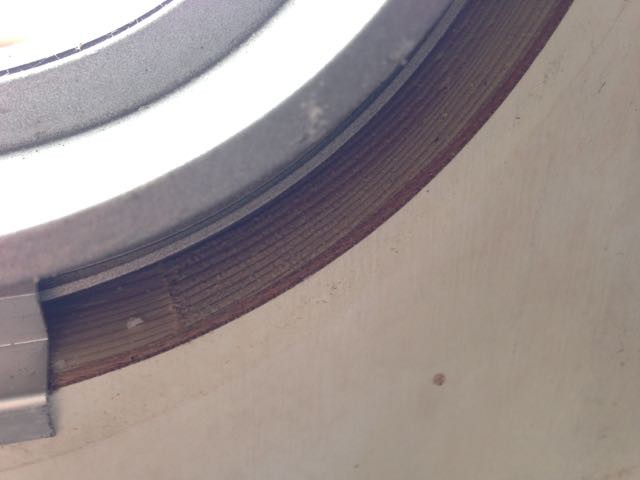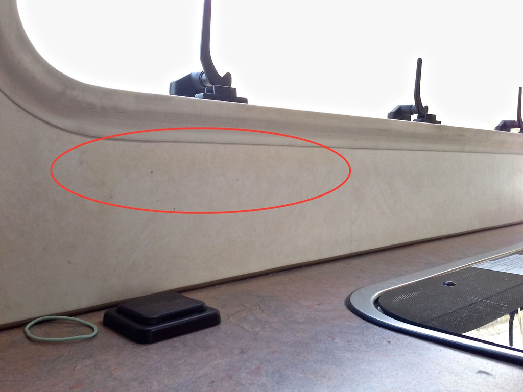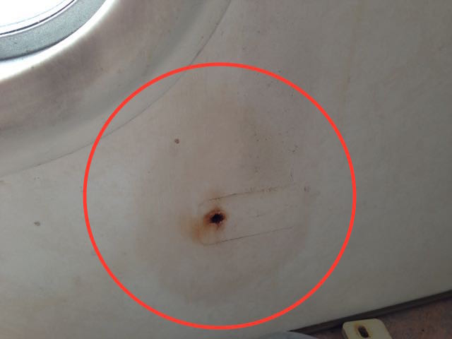 Auch am rechten Holm der Rollos ist ein Wasserfleck. genau um die Schraube herum. Auch da schlägt das Gerät an. Unter den Fenstergummis ist es jedoch staub trocken. Ein blick auf die Schraube sagt, dass dies wohl schon länger gegammelt haben muss. Ich habe das WoMo erst seit zwei Jahren, kann also über die Herkunft nichts sagen. auch die Schrauben der Fensterverriegelung muss ich herausbohren, da die Köpfe auch vergammelt sind. Doch auch da das gleiche Spiel: untendrunter staubtrocken.