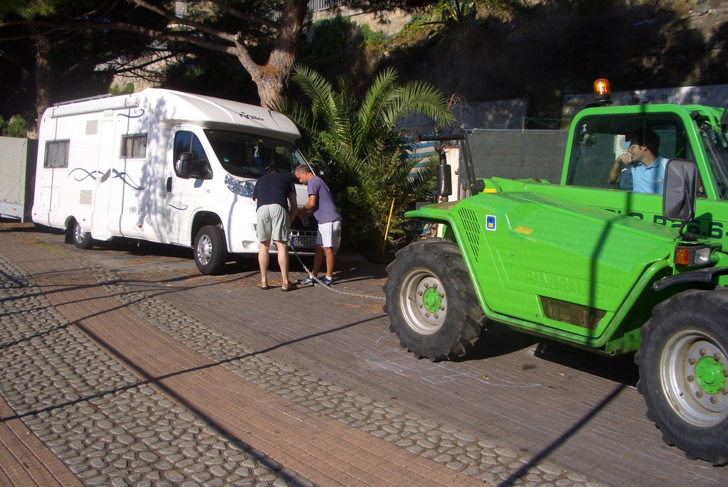Eiwei, gut das wir Spaß verstehen und blendender Laune sind (hoffe ich) Auszug aus dem Handbuch für Wohnmobilneulinge: Kapitel 666 Wie mache ich mir Freunde........ Gut das wir schönes Wetter haben und WE vor der Türe :loldev: . Festfahren geht auch ohne Regen, Sand und Gras. Vor einigen Jahren in Frankreich. Zum Höhlentauchen haben wir an einer Bucht am Straßenrand geparkt. Dort ging auch eine Abfahrt zu einem Feld runter. Da nicht genug Platz war und ich als erster dort war, bin ich halt rückwärts ein Stück da runter gefahren. Oben noch Asphalt, dann Erde und grober Schotter. Ich hab mich nachher auch nicht eingegraben, aber die Räder haben einfach nicht genug Grip bekommen, um das (durch den Winkel) hohe Gewicht in Gang zu setzen. Auch Wasser ablassen hat nicht gereicht. Ein Kombi mit einem Kletterseil davorgespannt hat es dann geschafft den nötigen Extrazug zu erreichen.