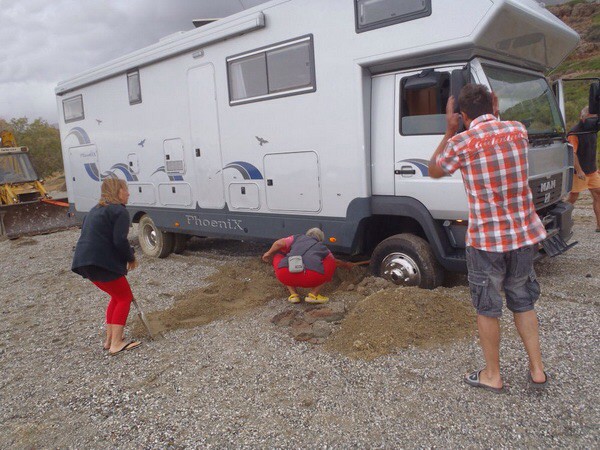 ....schon bei der 2. Tour habe ich es geschaft und das PitMobil erfolgreich im Matsch versenkt. Und ich dachte noch so bei mir "tu es nicht" , aber leider habe ich nicht auf mich gehört... Wir waren über Ostern an der von uns so geliebten Nordseeküste. Blauäugig fuhren wir Karfreitag morgens ohne Reservierung los. Die Fahrt war kein Problem, kein Stau, kein großartiger Wind, alles easy. Wir kommen also an der Küste an und müssen feststellen, alles voll. Unglaublich, dabei war es nur 5°C aber bei sonnigem, leicht bewölkten Wetter. Wir fahren also den Wohnmobilpark Norddeich an und fragen vorsichtig nach ob vielleicht noch ein Eckelchen frei wäre. Leider auch hier schon alles überbelegt, aber der Chef und Cheffin waren sehr freundlich und haben uns dann ein Eckchen gefunden wo der Boden (Wiese) einigermaßen fest und trocken war. Da habe ich das PitMobil erfolgreich hineinmanöveriert. Es stand, der Paltz war OK und ums Stromproblem kann man sich später immer noch kümmern. Leider meinte dann die beste aller Frauen " Irgendwie steht das Mobil schief " ich konnte es nicht bemerken, aber um des lieben Frieden wegen, die Keile raus, und......schon war es passiert. Trotz nagelneuen Ganzjahresreifen mit Schneeflocke, keine Traktion, schon ein wenig eingegraben und das Mobil stand immer noch wie vorher, was sich aber die nächsten 2 Tagen garnicht störend bemerkbar machte....Grummel...Weiber.... Strom besorgte uns der SP- Wirt vom nahegelegenen Hotel. Absolute Klasse der Service da. Kann man aber auch in meiner SP Platzbewertung, Norddeich Wohnmobilpark, lesen. Der SP Wirt war dann schon am grübeln, welchen Bauern er auf Ostermontag besorgen kann um uns aus der Wiese zu ziehen. Der Montag kam und bevor ich weiteren Flurschaden anrichte, fragte ich die anwesenden Mitcamper, die dann mit 4 Mann das Mobil anschoben. Es hat im ersten Anlauf geklappt und auf mein Bedauern wegen der tiefen Furche im ehemals jungfräulichen Rasen meinte der SP-Wirt nur, bis zum nächsten Mal wenn wir kommen (wir haben schon einen neuen Termin zum Drachenfest gebucht), sei alles wieder zugewachsen. So unvorbereitet erwischt mich das zukünftig nicht mehr. Im Ranger fahre ich Abschlepp und Bergeseile mit bestimmt 30m Gesammtlänge spazieren, habe Klappschüpp an Bord und was man so beim Offroadfahren braucht. Aber im WoMo = Nix ausser Kleinwerkzeug und Elektrikkleinteile. Jetzt sind 10m 5To Bergeseile und Schäkel verlastet und von den Traktionsmatten, Grippmatten hier Link zum eBay Artikel habe ich mir auch 2 Stk. bestellt. Wie haltet Ihr das ? HAbt Ihr ähnliches erlebt ? Ich danke an der Stelle den hilfsbereiten Mitcampern. Schade das es morgens um 11 war, also zu früh für ein leckeres Vulkänchen. Ganz besonderen Dank aber auch an das Stellplatzteam. Wir kommen wieder ! Hallo, wir haben das auch schon hinter uns, ich habe gar nicht erst versucht dort aus eigener Kraft rauszukommen. Es hat viel geregnet und ein paar Womo´s haben im Rasen ihre Spuren hinterlassen :D ![]() Einmal - Nach einem grossen Regen auf Kreta ... :oops: (Das Ganze hat dann beim Bagger-Fahrer zu Hause in einem typisch Griechischen Gelage geendet!) ![]() Ähnlich wie Acki erging es uns auch mal am Plage Napoleon, westlich Marseille. Glücklicherweise kamen zufällig die Männer der Müllabfuhr und schoben uns 'raus. Nicht im Sand, sondern Im Schnee steckten wir einmal in TanaBru/Norwegen. Ich ging dann zu einer Tankstelle um Hilfe zu holen, vergeblich. Als ich aus dem Kassenhäuschen wieder 'raustrat, spricht mich ein Einheimischer an und fährt mich mit seinem 4WD zu unserem Fahrzeug... welches er bereits 'rausgezogen hatte... :D In beiden Fällen hatten wir gottseidank gekühltes Dosenbier dabei. :razz: Hallo, ist mir vor einigen Jahren auf einem CP in GB passiert. Ein paar kräftige Engländer haben mich rausgeschoben und sich für die Bierdosen herzlich bedankt. Der Platzwart war auch nicht böse, dass ich den englischen Rasen zerstört habe. Hat dann allerdings noch 2 Stunden gedauert, bis die Gummidackerl und was wir sonst noch untergelegt hatten und wir selbst wieder von der schwarzen Erde befreit waren :cry: . Hallo, ich habe mich mal am Strand von Romo eingegraben :oops: Mit Sand schaufeln und anschieben kamen wir wieder raus. Ich achte mittlerweile sehr drauf wo ich rein fahre, nasse Wiesen meide ich so gut es geht. Ich habe auch 2 solcher Traktionshilfe dabei, je nach Untergrund stelle ich mich mit den Antriebsrädern dann auch da drauf. Das verhindert, dass die die Räder einsinken und man kann beim Anfahren etwas 'Anlauf' nehmen. Frank Wir KAMEN (2014) raus. ... ![]() ... ich habe nur gebetet, dass der Treckerfahrer nicht bremst, weil wir hätten auf der Schmierseife keine Chance gehabt. Im Stand lege ich Uniko 6in1 drunter.