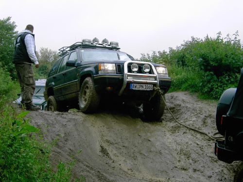 Habe ich auch Anfangs meiner Womozeit hinter mich gebracht. Am Strand lauter Pensionisten mit zwillingsbereiften Heckantrieb und ein Puch G. Der hatte aber ein Zelt angebaut und keine Lust es abzubauen. Bin dann mal ne schöne Weile gegangen bis ich einen Traktor gefunden habe. Da war aber nur ein kleines Mädchen. Mit Händen und Füßen hab ichs dann erklären probiert, und sie hat Papa mit den Traktor geholt. Der hats dann auch geschafft, war aber Grenzwertig. Der ging an der Vorderachse schon ziemlich in die Höhe. ![]() ![]() Fazit: Nach dem Urlaub den Ducato mangels Traktion und auch der Leistung wegen gegen den ersten Transit mit Heckantrieb und Zwillingsbereifung getauscht. Nun fahre ich schon den zweiten mit der selben Antriebsart und bin nach wie vor zufrieden. Man bekommt aber mit der Zeit auch ein Gefühl wo man nicht reinfahren sollte. bert Hängenbleiben kann man selbst mit einem Allradler. Hier gut zu sehen. Camp4Fun oben am Nürburgring. Müsste mein Bergfest 2008 oder 2009 gewesen sein. Am 5.2er Grand Cherokee war die Tracklock (Differenzialsperre hinüber) aber ich musste ja trotzdem in die Verschränkungssektion fahren........ ![]() Da ging nix mehr vor und nix mehr zurück. Ausgemittelt hingen diagonal die Räder 30cm in der Luft. Mit einen Allrad bleibt man an Stellen hängen, wo andere noch nicht mal zu Fuß hingelangen würden. Da habe ich in jetzt 30 Jahren Offroaden schon geile Storys erlebt. Wer selbst ebenfalls was geländetaugliches fährt und mehr zu den Bergfesten wissen will, darf sich ruhig per PN melden. Jau, hab meinen Allradler auch schon versenkt. Mußte auch unbedingt die Grenzen wissen. Niemand bricht die Grenzen der Physik :D . bert