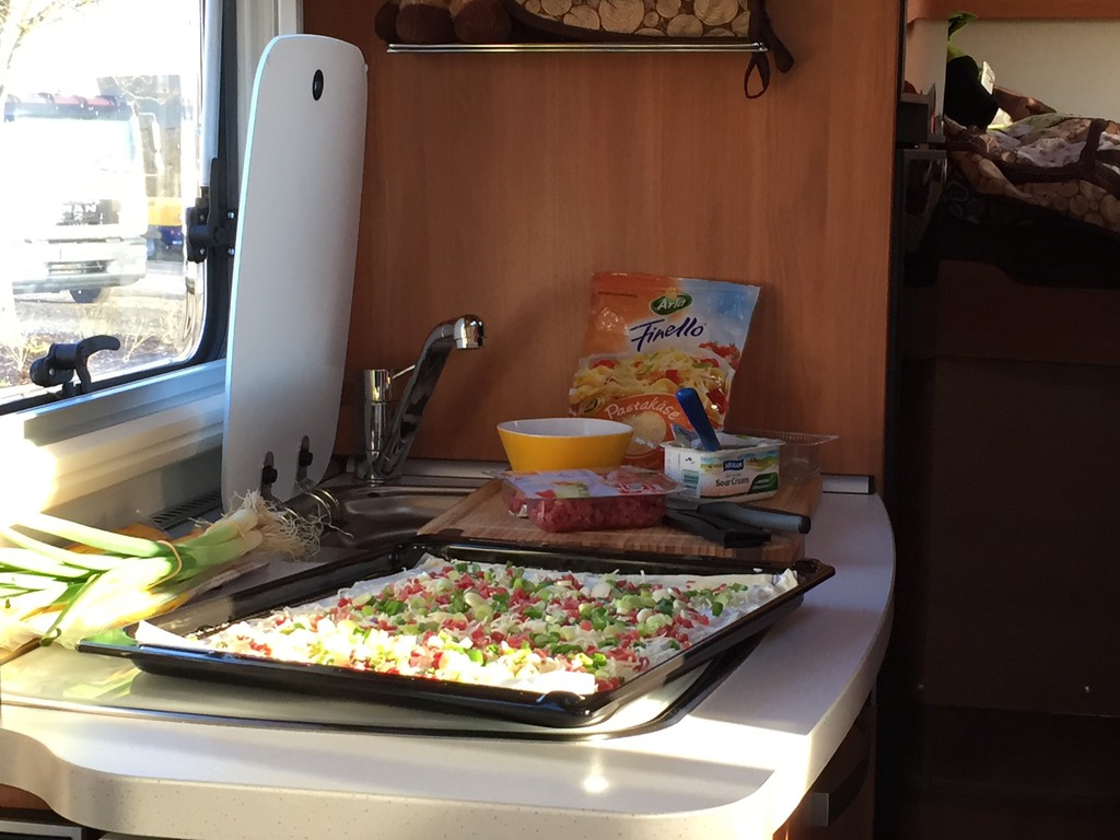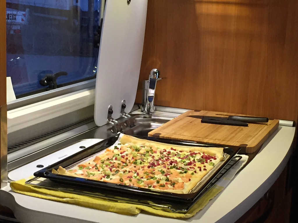 Bis es so ausschaut ca. 30min: ![]() Einfacher Kartoffelauflauf ![]() Zubereitung: Backblech mit etwas Butter einfetten Kartoffeln in Spalten schneiden und auf dem Blech ca. 20 Minuten im Ofen backen Tomaten in Scheiben schneiden und auf die Kartoffeln legen, mit Pfeffer und Salz würzen, dann mit geriebenem Käse bestreuen noch einmal ein paar Minuten überbacken frisches Basilikum drüber streuen fertig! Erdbeeren als Nachtisch :) Endlich bildliche Backofenverstärkung :-) Hmmm, lecker :ja: Hallo nochmal! Wenn noch eine Entscheidungshilfe gebraucht wird, bitte sehr! :wink: Elsässer Flammkuchen vor dem Backen: ![]() Elsässer Flammkuchen nachher: ![]() Christian Moin, im vorherigen Frankia hatten wir den SMEV Gasbackofen (mitteloft genutzt).Im jetzigen nutzen wir sehr häufig einen kleinen Elektroofen.Der ist leicht und klein und supergünstig.Verzichten würden wir auf keinen Fall auf einen Backofen.Es gibt Aufbackbrötchen die sehr lecker sind (Dinkel von C&W z.B.).Wenn es schmackhafte Brötchen vor Ort zu kaufen gibt (stehen meist auf CP),nehmen wir diese natürlich gern.Leider sind die Brötchen oft nicht gut.Dann Backen wir eben welche auf.Auch viele andere nette Sachen kann man zubereiten - wie gesehen.Das ein Wohnmobil mit Backofen länger sein muss sehe ich nicht. Natürlich kann man ohne Ofen auskommen.Nur Warum?? Ich bin in meiner Freizeit unterwegs - da lasse ich es mir gutgehen.Selbst die Mikrowelle nutzen wir ab und an (ist serienmäßig verbaut). Den "Naturburschen" würde ich sagen wollen:Wohnmobilreisen haben - unabhängig von der Ausstattung des Mobils - meiner Meinung nach rein garnichts mit Camping zu tun 8) . Hallo underdog: doch es gibt Mobile die über 3,5t wiegen und trotzdem sie alt und relativ günstig sind auch zwei Heringe vom Teller ziehen.Nimm meines:5,5 zulässige Gesamtmasse,trotzdem nur 6,7m kurz,Wandlerautomatik,dicker Motor (7,3L Diesel 170PS),23Jahre alt,Verbrauch 15-16Liter Diesel.Guck dich bei den Amis um,da findet man so etwas. Fred