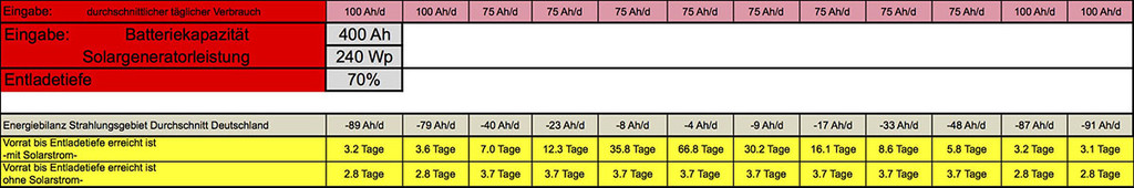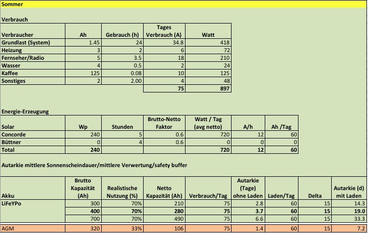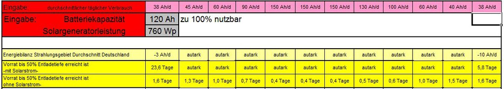 Ich muß schon wieder meckern. Die Einheiten sind zu einem guten Teil falsch. Das macht es nicht unbedingt einfach oder klar zu lesen. A-Ah W-Wh Laden/Tag ?? Ich hab da mal ein Excel gefunden ("stromplaner von clerk.xls" --> Link), das solche Berechnungen erleichtert. Bei mir kam fürs Licht knapp 8Ah/Tag raus, Pumpe 1Ah, Heizung 1,5Ah + 5Ah Gebläse(?), TV 6Ah, Laptop nach Verwendung. RK Ganz nett für eine Abschätzung... Die Praxis sieht meist anders aus, das Wetter spielt nicht so mit, wie in Excel, man schaut mal länger fern oder die Frau föhnt intensiver... Leistungsreservern sollte man immer einplanen. Bei einer Streuung von Bedarf zwischen 140Wp ... 1200Wp über das Jahr (das 10-fache im Winter) ist eine Berechnung eher akademisch. Auf dem Dach einer Weissware passen ca 500Wp + SAT Schüssel drauf, die sollte man ausreizen, dann ist man im Mittel gut unterwegs bis in den Spätherbst. Die Akku Kapazität kann nie groß genug sein, ist aber vom Platz und Zuladung abhängig. 2x100Ah AGM gehen unter den Beifahrersitz, sonst muss man Stauraum opfern. LiFeYPO4 ist leichter, passt aber nicht unter dem Sitz und ist teuer. Auch hier: viel hilft viel. P.S. Im Sommer kann man überschüssige Solarenergie super für den Kühlschrank / Decken-Lüfter am Tag hernehmen, das spart Gas... Ok, die Kritik ist berechtigt, wenn man die Berechnung allein ansieht. Als grobes Schätzeisen war das für mich unter Ermangelung der hier verlinkten Alternativen hilfreich für meine Entscheidungen. Ich muss feststellen, wenn ich das mit dem wesentlich sophistizierteren Sheet aus dem ersten Link von AMBTD vergleiche, dann liege ich noch nicht mal weit davon entfernt. 8) Die Frage war aber, welche Verbraucher wir betrachten und wie lang wir sie nutzen, was ich mindestens mal mit Beispielen in meinem Beitrag auch gezeigt habe. Den Rest hätte ich mir vermutlich schenken können zu zeigen :oops: aber dafür war mein "Entwicklungsaufwand" quasi null und das Ergebnis deckt sich im Nachhinein trotzdem mit meinen täglichen Erfahrungen - haken wir es also ab unter dem bekannten Theorem von "Theorie und Praxis" :razz: :D nun hat es mich gereizt und habe ich mit dem sheet (1. link von AMBTD) doch noch kurz beschäftigt und mal meine Werte eingetragen. Dafür musste ich das sheet dahingehend ändern, dass ich 70% entnehmen kann (kann ich natürlich jetzt einstellen daher auch der zusätzliche Parameter :) ), also genauso viel wie ich auch in meiner Pi mal Daumen Methode unterstellt habe. Das Ergebnis überrascht mich nicht wirklich... Trotz all meiner Ungenauigkeit produzieren beide fast das gleiche Resultat bezogen auf mein gegebenes Ziel :D Habe hier den relevanten Ausschnitt angehängt. Heuristik ist theoretisch schlecht aber praktisch besser als ihr Ruf. Ah ja, das soll keine Werbung für meinen Weg sein, das andere sheet ist sicher deutlich besser. Bleibt natürlich der berechtigte Hinweis, dass in der Praxis auch in beiden Fällen nicht berücksichtigte Parameter eine wesentliche Rolle spielen können. Aber es geht ja auch nicht darum, jeden Tag exakt vorherzusagen sondern ein vernünftiges Sizing für den durchschnittlichen Tag zu bekommen. Sic! Frank ![]() So sieht mein Verbrauch aus. ![]() Winter: Kein Autoradio, Toaster. Sommer alles was geht und den Kühi auf 12 V. Mensch Uwe , Hast du 750 Watt Solar auf dem Dach ? Wo passen die denn drauf. Es sind 760 Wp :wink: 10 Module, 5 verschieden Hesteller/Größen und 3 Solarregler. ![]() Ich finde die Excel-Berechnungen von "Wasserburger" interessant, ich habe mir auch eines gebastelt und in dem neuen Magazin "Reisemobilist" ist auch eine Berechnung abgedruckt. Aber alle sind halt keine induviduell bedarfsgerechten Berechnungen. Man sollte sie alle als Hilfe betrachten, um überhaupt mal eine Ahnung zu bekommen was man braucht (oder brauchen könnte). Die Absicherung/Reserven sind eh eine Sache des Geldbeutels. Ist der klamm, sind halt keine Reserven da, ist er prall gefüllt, kann ich meine autarke Zeit auch mal verdoppeln. Nur meine Meinung, Andreas |