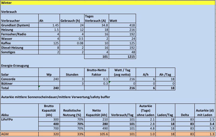 Viele wollen wissen wie groß muss den der Akku wirklich sein ? Bitte tragt mal so Eure Verbraucher mit Zeitangabe ein. z.B. E-Bike ,Föhn, Grundrauschen z.B. Alle stillen Verbraucher ( Stand By , von Geräten) So kann jeder es ungefähr einschätzen und daraus die Größe ermitteln. Hallo zusammen, ich habe mir ein einfaches Excel Sheet gebastelt, mit dem ich auf der Basis von einfacher Heuristik simulieren konnte, um die für mich richtige Grösse zu ermitteln. Es sind auch ein paar typische Verbraucher inkl. des geschätzten (zum Teil gemessenen) Bedarfs. Die Grössen sind eher konservativ ausgelegt aber ich denke, das ist angemessen, um die Minimum Kapazität zu berechnen. Die Zeile mit den Büttner Panels steht noch drin, weil ich das als Erweiterung in Erwägung gezogen hatte. Am Nullertrag erkennt man, dass ich bei der letzten Berechnung die Option nicht gewählt habe ... :) Mein Ziel war, mindestens 3 Tage im Winter ohne Landstrom oder Bewegung des Fahrzeugs (LIMA) frei stehen zu können. Im Sommer gelingt mit ein wenig mehr Solar-Ertrag (nicht unrealistisch) völlige Unabhängigkeit für eine lange Zeit, geschätzt von April bis Oktober. Meine ehemalige AGM Kapazität habe ich zum Vergleich mit betrachtet. Frank ![]() ![]()