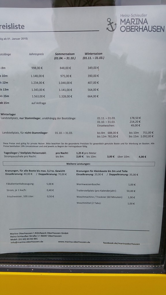 Wir waren am Wochenende um den 11.04.2015 auf diesem Stellplatz in Oberhausen da wir Musical-Karten im Stage Metronom Theater hatten und uns der andere Stellplatz in Oberhausen nicht zusagte (Strom 50ct/2h=6€/24h). Dieser Stellplatz liegt direkt am kleinen Marina (Hafen) von Oberhausen auf einem Schotterplatz. Bis zum Theater, zum Kino und zum Centro sind es ca. 5min Fußweg, zum Sealife (in Sichtweite) muss man nur einmal um das Hafenbecken rum (1-2min). Wir haben bei unserem Besuch den Hafenmeister leider nicht angetroffen (als er am Platz war, waren wir im Musical und danach essen), konnten aber alles telefonisch klären und das Geld im Briefkasten deponieren. Strom gibt es für Womos an dem kleinen Häuschen bei dem auf den Bildern die Stühle gestapelt sind und nicht hinter der Absperrung am Hafenbecken. Dies haben wir erst am Morgen nach unserer Anreise erfahren, daher der Hinweis. Am Abend gibt es hier einige Spaziergänger und über den Tag verteilt auch mal Angler. Auf der anderen Kanalseite ist die Autobahn und die Bahnschienen sind nicht weit so das ein gewisser Geräuschpegel herscht. Dieser ist aber eher im Hintergrund und nicht so störend wie man vielleicht denkt. Also sogar meine Freundin mit ihrem leichten Schlaf konnte mit offener Dachluke schlafen. Preise für den Stellplatz und Strom richten sich nach der Fahrzeuglänge: 1,25€ pro Meter + Strom: Bis 8m 2€, bis 10m 3€, über 10m 4€ pro Nacht. Auf dem Aushang steht etwas von Fäkalientankentsorgung, ob dies auch bei Womos möglich ist weiß ich nicht. Die Sanitäreinrichtungen haben wir nicht benutzt und können sie entsprechend auch nicht bewerten. ![]() ![]() ![]() ![]() ![]() André :) Auch wir habe diesen Stellplatz besucht ! :) Vorteile : Noch dichter am Centro als der Busparkplatz am Gasometer, direkte Lage am Rhein-Herne Kanal, Dusche und Toilette in absolute perfektem Zustand, Dusche 1 Euro, Sea Life auch direkt am Stellplatz Nachteile : Durch die Nachbarschaft zur Autobahn und auch zur Eisenbahn schon ziemlich laut, aber nicht so laut wie der Parkplatz am Gasometer, ziemlich enge Zufahrt des Platzes. Wir haben fuer 2 Uebernachtungen mit unserem Carado (6,40 m Laenge) 19 Euro bezahlt, inkl. Strom und Duschen / Toilette. Hier noch ein paar Bilder vom Stellplatz ![]() ![]() und von der doch ziemlich engen Zufahrt ![]() ![]() von der schoenen Mittelmosel Achim Nachtrag März 2016 Wir waren am Sonntag den 13.03.2016 auf dem SP an der Marina. Der Hafenmeister war nicht in seinem Büro. In der Scheibe hing seine Handynummer. Bei der Nummer meldete sich niemand. Wenige Minuten später rief der Hafenmeister zurück. Er bat uns die SP Gebühr in den Briefkasten zu werfen. Preise sind geblieben. 1,25 € pro Meter und 2€ Strom (pauschal) Es gibt keine Briefumschläge oder Anmeldezettel. Auf dem SP befinden sich 4 Stromdosen. V/E habe ich keine gesehen. Für Dusche und Toilette braucht man einen Code. Den hatten wir nicht. Die gegenüberliegende Autobahn A43 ist leicht zu hören. Am Kanal entlang kann man gut mit dem Hund laufen. Achtung: Kaninchenalarm Die Schranke auf dem Bild von Achim wurde irgendwann nach 22 Uhr mit einem Vorhängeschloss geschlossen und erst am nächsten Morgen um 8 Uhr wieder geöffnet. ![]() ![]() ![]() ![]() :) Alles noch beim Alten :) allerdings gibts jetzt deutlich mehr Stromsteckdosen, und das ist gut so ! ! ! Ansonsten absolute naehe zum Centro, und somit Gastronomie in Huelle und Fuelle. Gruss von der schoenen Mittelmosel Achim Hat sich nichts verändert! ![]() Doch hat es :!: Ganz in der Nähe hat ein Tiger Jump eröffnet. Eine riesige Halle in der man das Trampolinspringen erlernen kann. --> Link Julia Wir waren Anfang Juni 2017 dort, angekommen am Pfingsmontag für eine Nacht. Der Hafenmeister musste erst gefunden werden, dann konnte ich uns anmelden, zahlen und auch den Code für die Sanitäranlagen erfahren. Der Platz war fast voll. Sehr laut durch Bahn, Straßen und am Tage die vielen Freizeiteinrichtungen, insbes. vom Sealife. Platz recht staubig. Keine V+E. 12,50 € incl. Strom, Duschen 1 €. Leider funktionierten 3 von 4 Dusch-Münzautomaten nicht. :D Also wenn der Hafenmeister nicht vor ort ist ! :D kann man nebenan in der Bootsschule zahlen. Gruss von der schoenen Mittelmosel Achim Aktuell 2018 kostet der Platz 15 EUR pro Nacht. Strom inklusive V/E ist im Winter geschlossen, fällt also aus. Laut ist der Platz vor Allem durch die Bahnlinie, auf der Nachts aber weniger Verkehr ist. Der HAfenmeister war auch bei uns nicht anzutreffen.Aber nebenan in der Bootsschule konnte ich mein Geld loswerden. Sanitäranlagen hab ich nicht besichtigt, waren aber vorhanden und der Code steht auf der Rechnung. Nebenan gibt es ein großes Schwimmbad im Bergwerk - Style. :) Ist so richtig ! :) Die unterschiedlichen Gebuehren nach der Laenge des Wohnmobils werden nicht mehr erhoben, statt dessen Pauschale 15.00 Euro Weiterhin gibt' s eine Seite, auf der man Online reservieren kann, und zwar hier --> Link Guss von der schoenen Mittelmosel Achim :) Waren jetzt am Wochenende noch mals da :) Die Stellplaetze sind jetzt abgetrennt, durch bordsteinaehnliche Betonteile. Abstand ist nicht wirklich gross. Aber ausreichend. Das ist schlechter wie vorher, besser ist allerdings, dass man reservieren kann, per Internet. Vor dem Einfahren muss man beim direkt angrenzenden Hallenbad Aquapark 15 Euro pro Tag zahlen. Und erhaelt noch einige touristische Flyer und eine praktische Stofftasche. Beim Bezahlen im Aquapark standen bestimmt 50 Leute vor mir, die alle ins Bad wollten. Doch keine Bange, das geht echt zuegig. Strom ist pauschal mit drin. Toilettten, Dusche alles noch per Zahlencode und alles vorbildlich. Wir werden diesen Platz sicher nochmals aufsuchen und empfehlen ihn auch. Gruss von der schoenen Mittelmosel Achim Waren jetzt wieder mal in Oberhausen. Der Stellplatz wurde deutlich vergrössert. Jetzt ca 35 Plätze. Der Sandkasten wurde entfernt. Weitere stromanschlüsse geschaffen. Alles sehr vo