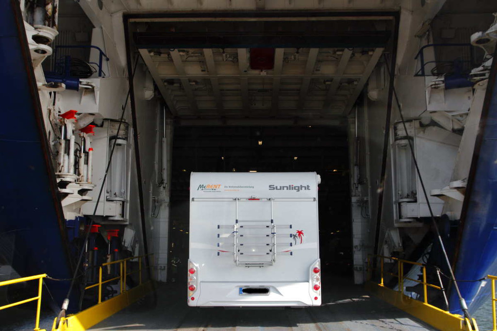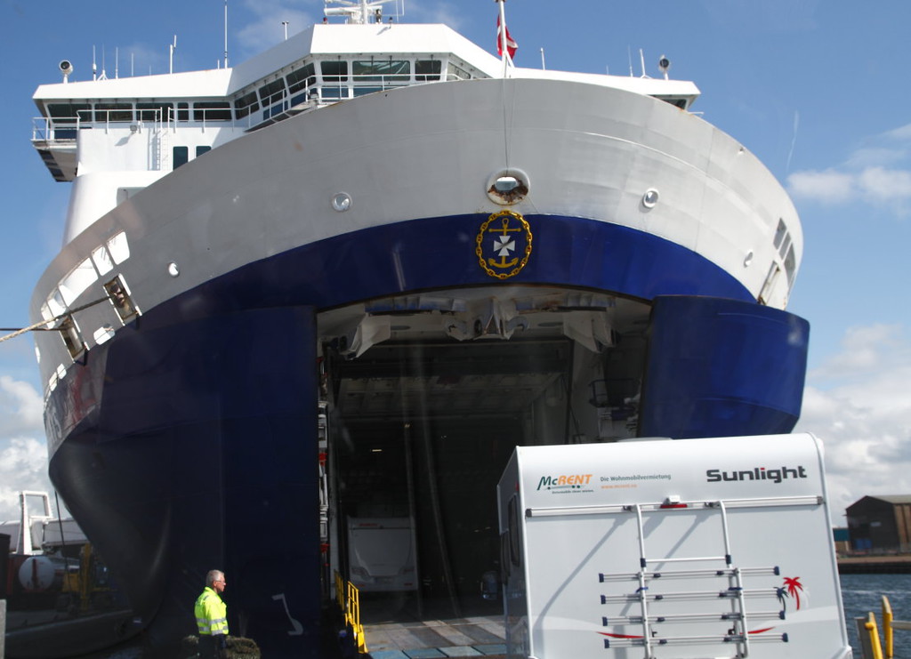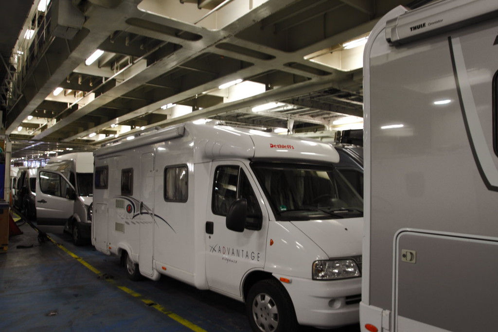 Sobald Fahrzeug steht, also Handbremse und Gang rein, evtl. Keile in beide Richtungen einlegen. Die eigentliche Auffahrt aufs Schiff ist unproblematisch, nur die "Seitenrampen" und Zwischendecks sind evtl. steiler anzufahren.