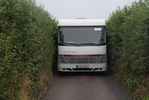 Das glaubt man, wenn man die Bilder sieht wirklich nicht. Der Globebus wirkt, als wäre er 2,50m breit...... :wink: Roman Hallo Vemi, vielen Dank für die beiden erhellenden Bilder. Wie ich schon immer sagte: Es ist noch keiner stecken geblieben, also keine Bange. Ich bin gerade in Schottland unterwegs (2,3m breit) und mache ähnliche Erfahrungen. Solange es einen Mittelstreifen gibt, kann man ja noch im Rückspiegel kontrollieren, ob er noch zu sehen ist. Ohne wird es kritischer. Oder wenn man links schon keine Markierung mehr sieht und rechts immer noch kein Platz ist. Dazu die Schlaglöcher links, die man notgedrungen mitnimmt bei Gegenverkehr oder so unübersichtlichen Stellen, daß man sicher gehen muß. Komischerweise findet man da auch noch Gullideckel mitten am Land, weit entfernt von einem Ort. AB Auffahrten sind IMHO unkritisch. Wenn man parallel steht, sieht man ja alles im Rückspiegel. Im Kreisverkehr steht man ja erst in brauchbarem Winkel um zu sehen, ob wer von rechts kommt. Dann halt die richtige Spur nehmen und halten, dann ist der restliche Verkehr relativ egal. Was mir noch auffällt ist, daß die Engländer meist erst sehr spät das Licht anmachen. Auch in der Dämmerung oder im dunklen Wald sind viele ohne Licht unterwegs. Und daß in den Orten überall am Straßenrand geparkt wird. Auch wenn dort 64 oder 80 erlaubt ist und so nur noch ein Fahrzeug durchkommt. RK Viel störender als die geringe Breite fand ich die geringe Höhe. Bäume werden anscheinend nicht geschnitten sondern nur von LKW "Abrasiert", auf nebenstrecken ohne rasende LKW eben entsprechend nicht. Ich meine die Enge der Straßen ist nur im Süden der Insel manchmal das Problem. Die Hecken stehen seit Heinrich dem VIII. haben unten einen kräftigen Wurzelansatz, der in die Wege ragt und nach oben reichen sie eben manchmal bis zu drei/vier Metern. Sicht Null, Trockenreinigung des Mobils zu 100% gewährleistet. Mietmobilfahrer sollten die kleinen Straßen meiden. Speziell im Dartmoor gibt es einige solcher Engstellen! Im Rest des Landes ist das Fahren auf den Singleroads in der Regel kein Problem. Gerd Täusche ich mich oder sind hier tatsächlich einige Inselliebhaber damit beschäftigt, möglichst viele Noobs von einem Besuch unseres geliebten Nicht-Kontinents abzuhalten? Zuerst war es zu eng, jetzt auch noch zu niedrig. Was kommt als nächstes? Ultratiefe Schlaglöcher? Macht nur weiter so. Mir soll es recht sein ...