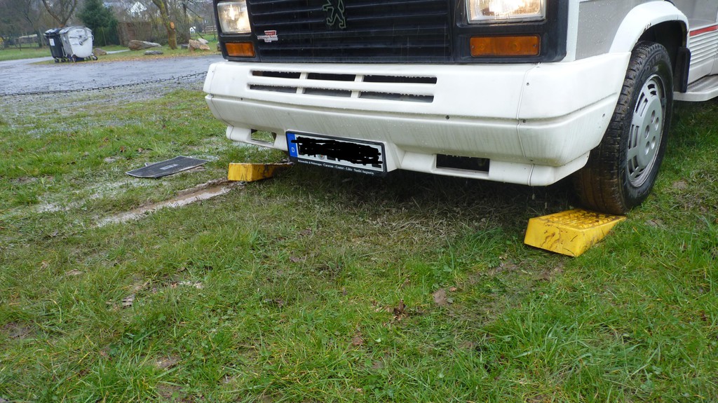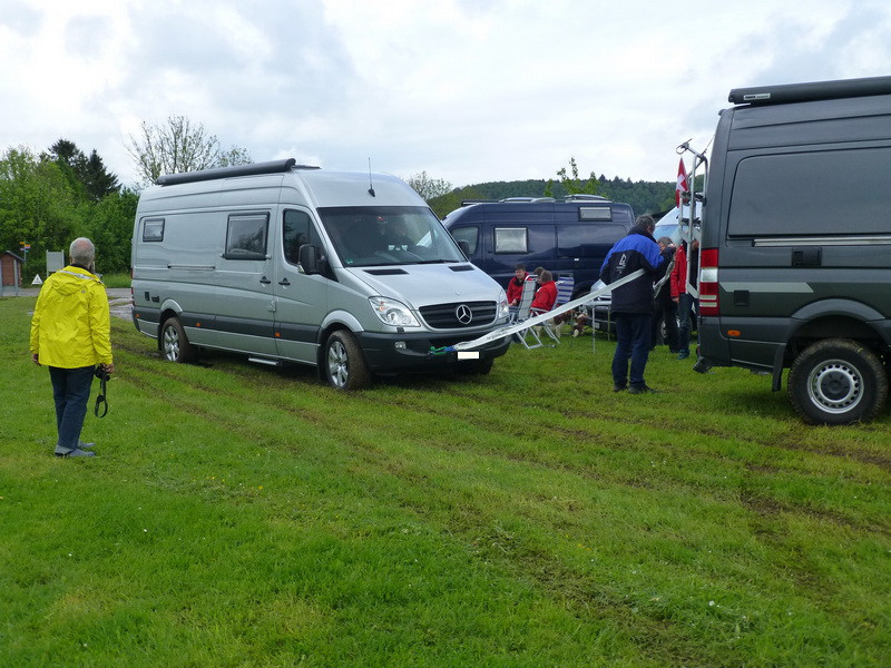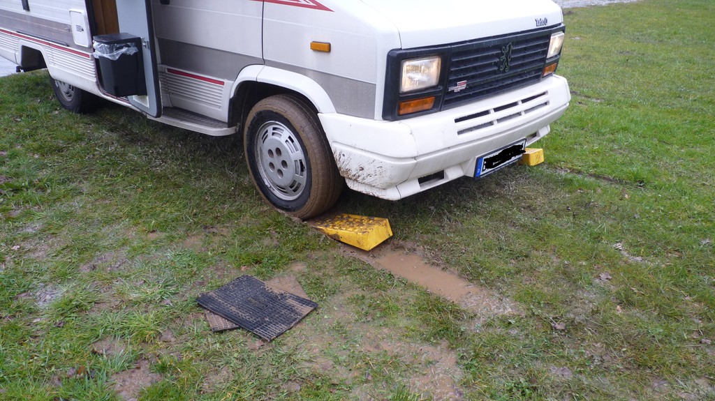 toller Start unserer Ostertour. Auf unserem Lieblingsstellplatz in Veldenz an der Mosel angekommen sehe ich das unser bevorzugter Standplatz noch frei ist, also zügig drauf gefahren. Nach dem Aussteigen dann festgestellt, dass die Wiese ziemlich nass ist. Tiefe Furchen neben uns deuten an, dass man auch vorher schon Probleme hatte. Nun gut dachte ich werden wir morgen sehen. 8) Ungünstigerweise hat es dann auch noch die ganze Nach geregnet. Nach dem Frühstück am anderen Morgen also der Versuch da wieder raus zu kommen. Kurz die Kupplung kommen lassen - keine Chance, rechtes Rad dreht sofort durch! Ein Königreich für eine Differentialsperre :D Habe immer solche Gummimatten mit, die ich auch schon erfolgreich eingesetzt habe. Also 2. Versuch - Fehlanzeige: Matten werden unter dem Rad durchgezogen. Ich habe dann, nach etwas Überlegung eine für mich neue Methode probiert - die gelben Keile! Die Keile vor die Räder gelegt und vorwärts draufgefahren. Dann mit Schwung rückwärts runter. Bin so etwa 30 - 40 cm weiter gekommen. Keile wieder vor die Räder und nochmal, dass ganze so 5 oder 6 mal und wir waren draussen :razz: