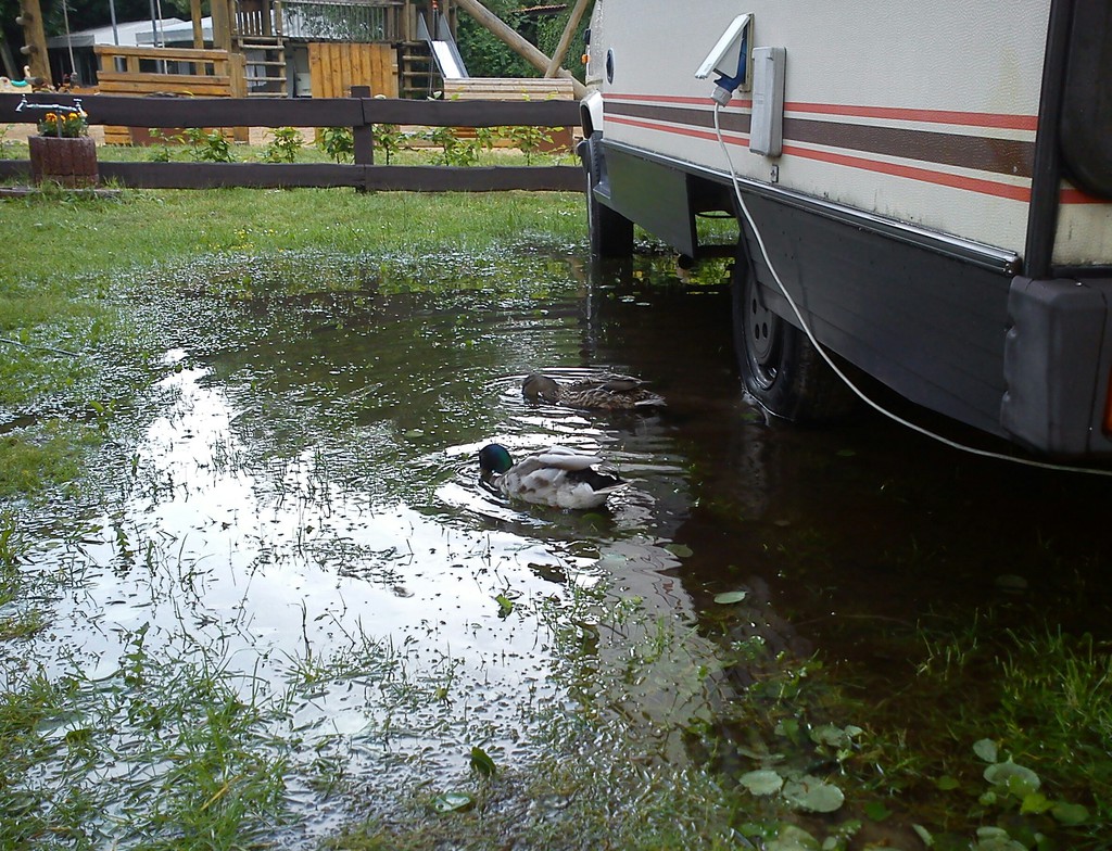 Es gibt wohl kaum jemanden unter uns, der nicht schon mal kalt erwischt wurde. Entweder erweisst sich die Wiese als doch nicht so tragfähig wie gedacht und geprüft (uns Ostern passiert), oder ein plötzliches Gewitter oder Regenschutt versenkt einen. wenn man nicht gerade ausschließlicher Betonplatten und Rasengittersteincamper ist, passiert so was halt schon mal. Es gab nur einen bisher, der damit keine Probleme hatte. Der konnte aber auch und sogar übers Wasser laufen :ja: .