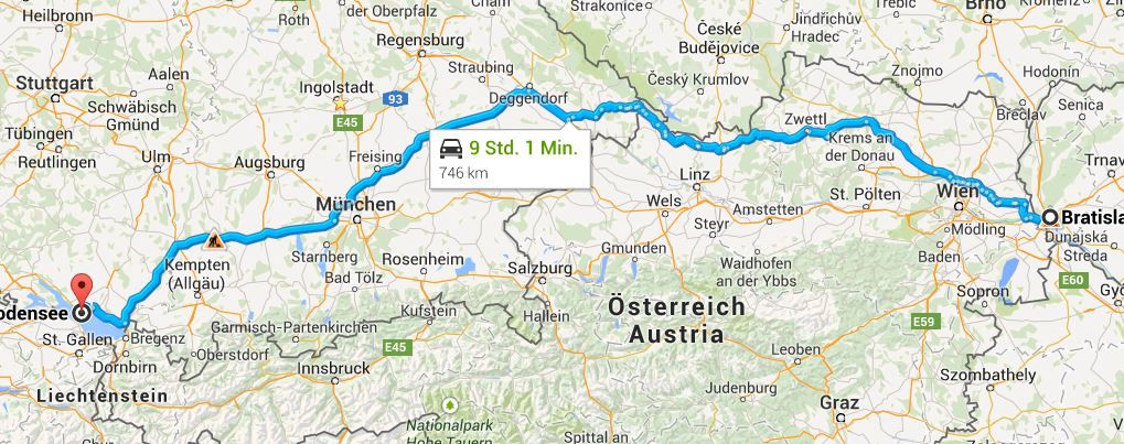 Ich mal vor ein paar Jahren, als ich zum Fliegenfischen an eine "neues, unbekanntes" Ziel fahren wolle (Slowakei, "Hohe Tatra") vom "Bodensee" auf der A-96/99 um München, dann nach Braunau und Passau und weiter alles entlang der Donau, bis kurz vor Wien, gefahren. Dann aber, um einen Freund zu besuchen, nach Wien hinein und später wieder auf der Landstrasse nach Bratislava.