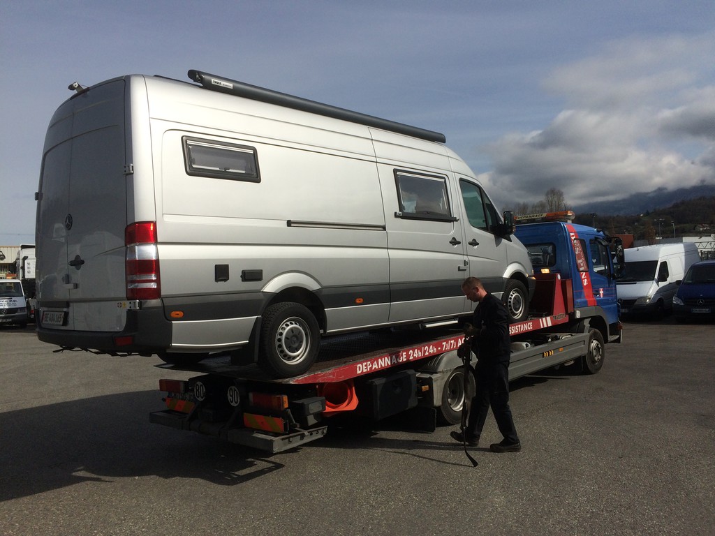 Als wir am Freitag nach dem Frühstück starten wollten, ging die Zündung normal an, Strom war vorhanden, aber der Anlasser rührte sich nicht. Ein paar mal probiert, nix ging, dann den MB Notdienst angerufen. Der Abschleppwagen kam recht schnell, der Monteur versuchte es erst mal unter dem Fahrzeug mit dem Schraubenzieher, der Anlasser drehte zwar, aber der Motor sprang nicht an, da er keinen Sprit bekam. Also den Sprinter aufgeladen, er brachte uns in die ca. 10 km entfernte MB-NFZ-Vertretung nach Chambéry. Zum Glück war am Karfreitag kein Feiertag in Frankreich. Kurz nach 11 Uhr angekommen, machte sich ein Monteur mit der Diagnosestation über unseren Kasten. Dann war erst mal von 12 - 14 Uhr Mittagspause. Kurz nach 15 Uhr war alles fertig.