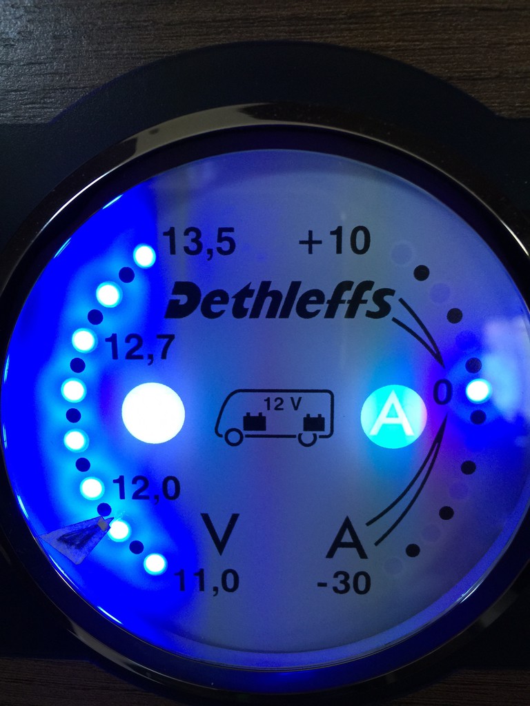 Schaut mal das Schätzeisen an. Wieviele LED sollten minimal leuchten? Wo ist der Grenzbereich. Wann spätestens an den Landstrom anschließen? Da, wo der Aufkleber ist? Bitte keine Tipps, dass ich einen Batteriecomputer einbauen soll. Wirklich Tipps bezogen auf das Schätzeisen. Herzlichen Dank. ![]() Hallo, wenn es sich um eine Blei-Saeure-Batterie handelt bei 12,0 Volt = ~50% entladen. In deinem Fall also bei der 3.LED. LG Wolfgang Das lustige am Schätzeisen ist ja, dass die Spannung links vom Strom rechts abhängt. Wenn der 0 ist (wie auf dem Bild), ist die Batterie bei 11.8V leer und bei 12.8V voll (AGM, 20°C), jeder 0.1V Schritt entspricht dann in etwa 10% der Kapazität). Bei + Werte bis zu +10A wird die Batterie ja schon geladen, da muss man nichts machen, bei -30A hängt was dickes an der Leitung (300W), da darf die Spannung schon mal etwas nachgeben. Du kannst den Ladezustand nur Anhand der Batteriespannung beurteilen, wenn KEIN Strom fließt UND die Batterie 15-20 Minuten ruht. Alles andere ist nicht aussagekräftig (Batteriekapazität spielt eine Rolle, Batterietyp auch - Thema Innenwiederstand, auch Alter der Batterie etc. etc....) Laut Deiner Anzeige wurde die Batterie gerade geladen und hat sich noch nicht wieder beruhigt (13.5V) oder hängt am Erhaltungsladen mit einem zu vernachlässigenden Lade-Strom. Habe das gleiche "Schätzeisen". Gute Bezeichnung " :ja: Bei diesem Bild heißt das für mich: Alles im grünen Bereich denn mein BC von Victron sagt in digitalen Ziffern genau das Gleiche. ;D War noch nie unter 6 LEDs Das Insrument muß nicht schlecht sein, s.Vergleich mit Victron. Mangelhaft ist aber, daß die Ladeschlußspannung (14,4 bzw.14,7, mit Temp.-Komp.u. Kälte höher, nicht angezeigt wird, bei 13,5V ist Schluß. Die aktuell 13,5V ist Oberflächenladung nach Aufladen, durch stundenlanges Warten oder kurze Belastung mit 2-3A wird diese beseitigt u. die reale Betr.-Spannung (12,7-12,8V) angezeigt. Ansonsten wie von bcmcg beschrieben. Gr, Richi |