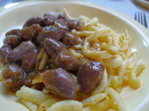 Zum Abendessen gabs Hühnerherzen in Rotwein-Orangensoße mit Spätzle und Salat.