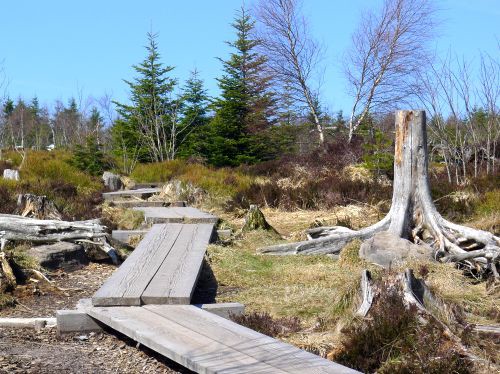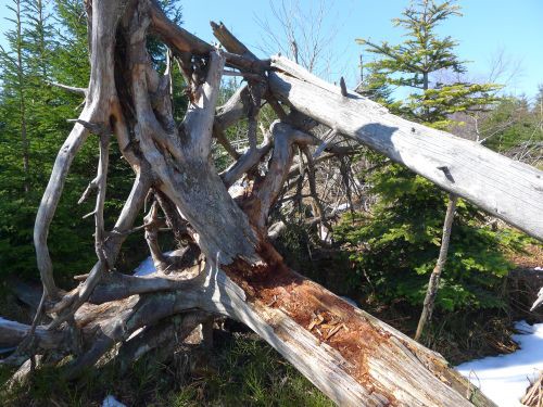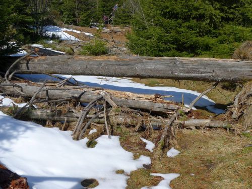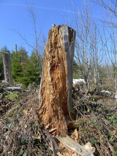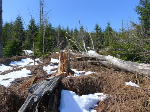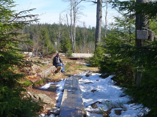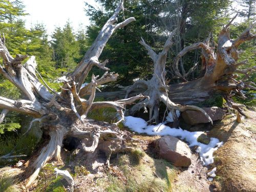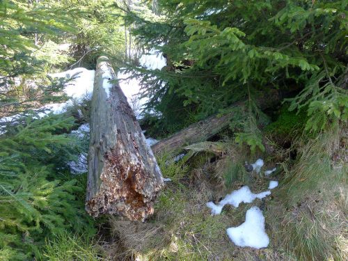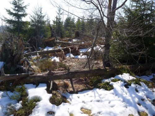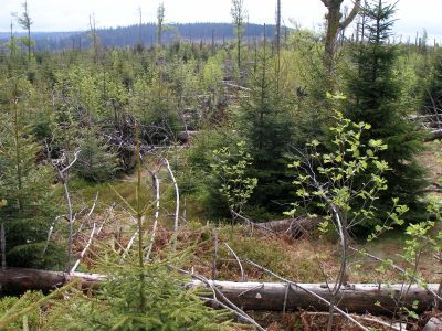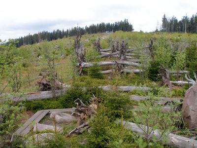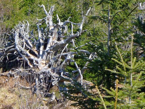 Hier wurde eine 10 Hektar große Sturmwurffläche des Orkans Lothar vor 15 Jahren sich selbst überlassen, um die natürliche Regeneration in diesem Bannwald zu beobachten. Wir waren vor 6 Jahren zuletzt hier, und seitdem hat sich doch viel verändert. Die riesigen Baumleichen sind zum größten Teil schon verrottet und im Unterholz des neuen Waldes, der sich schnell entwickelt, verschwunden.