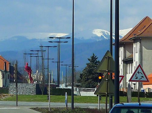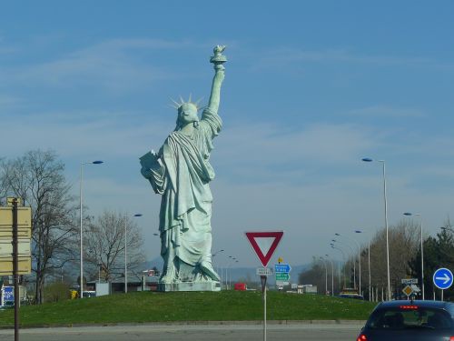 Heute werden wir von Carl geweckt, der ganz schlimm den Atem zieht oder hyperventiliert, falls Hunde sowas überhaupt tun. Vielleicht wars aber auch nur harmloses Rückwärtsniesen, aber ein ordentlicher Schreck in der Morgenstunde. Nach paar Minuten ist der Spuk vorbei und unser Mäusi ist wieder normal. Wir nehmen an, dass es Stressbewältigung ist, denn alles riecht nach läufigen Hündinnen. Nach dem Frühstück packen wir und sagen der Navi-Tussi, dass wir nach Friesenheim wollen. Hinter Colmar verabschiedet uns die Freiheitsstatue...