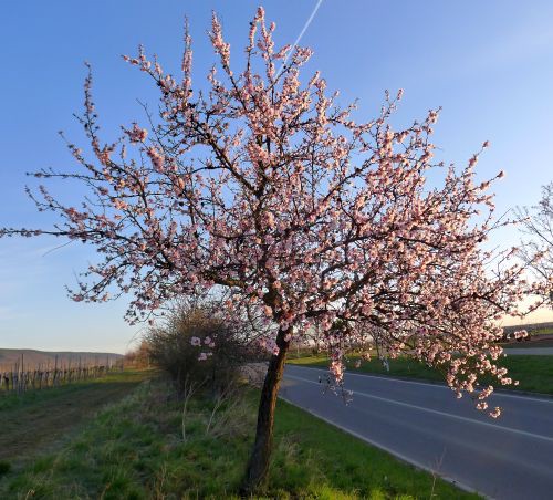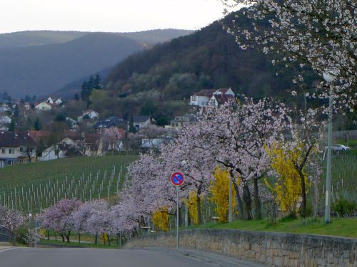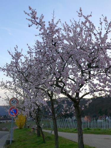 Eigentlich wollten wir heute früher losfahren, damit wir nicht in den Feierabendverkehr reinkommen, aber Peter kam erst um 16:30 nach Hause. Wir gerieten also gleich bei Darmstadt in einen fetten Stau. Und weils hinterher so gut lief haben wir die Ausfahrt Lorsch, unser heutiges Tagesziel, verpasst. Auch gut, fahren wir nach Gimmeldingen zu den Mandelbäumchen, das liegt ja auch auf der Strecke. Vor zwei Wochen waren sie noch nicht aufgegangen, aber heute haben wir Glück.