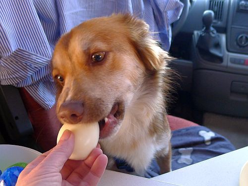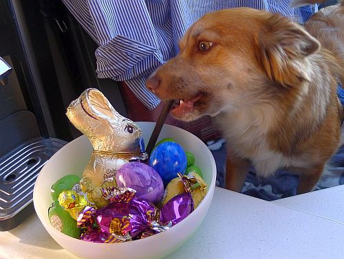 Für Carl hat der Hase natürlich auch was gebracht. Er hat sein Pansenstäbchen gleich entdeckt. Ein Ei gibts auch noch. Er soll ja nicht leben wie ein Hund.