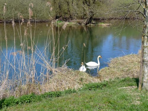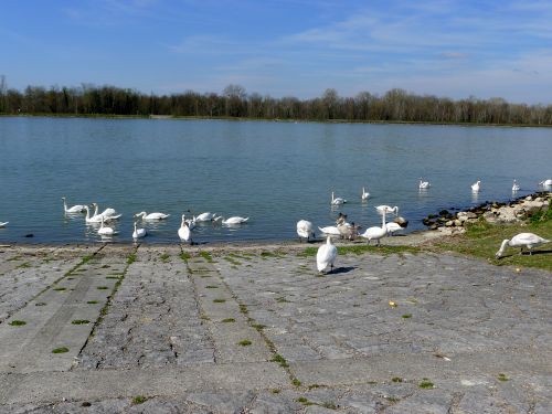 Das Sträßchen führt auf dem Damm entlang und wir kommen zu einer Parkbucht mit massenhaft Schwänen.