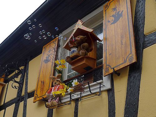 Überall ists österlich geschmückt, und der Bär pustet kräftig bunte Seifenblasen.