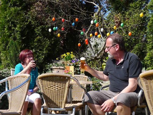 Kurz vor Bad Schönborn nervt uns aber der LKW-Verkehr und wir biegen ab. Wir haben Glück und erwischen einen Eckplatz und sitzen nicht direkt auf dem Präsentierteller. Passt.