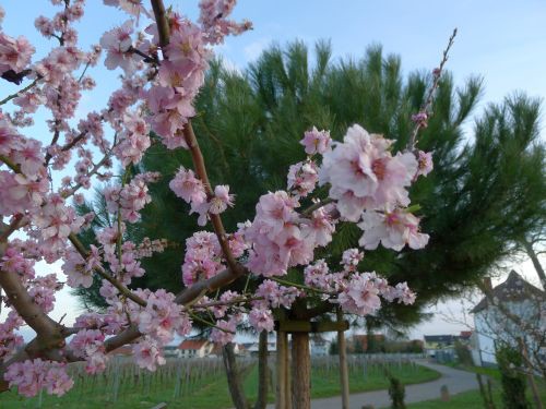 Diesmal haben wir die rosa Mandelblüten gesehen. Leider lagen sie schon im Schatten der Berge, und die Farbe kommt nicht wirklich gut rüber, aber es sind wirklich die rosa Ziermandeln. Sie haben den Sturm der letzte Tage überstanden.