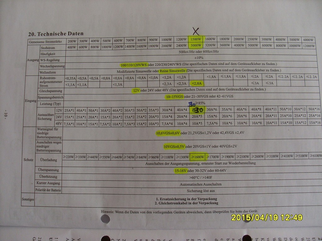 Ich muss noch nachtragen dass der Wechselrichter 1500 Watt Dauerleistung hat, sowie bis 3000 Watt kurzzeitig (Anlaufstrom).
