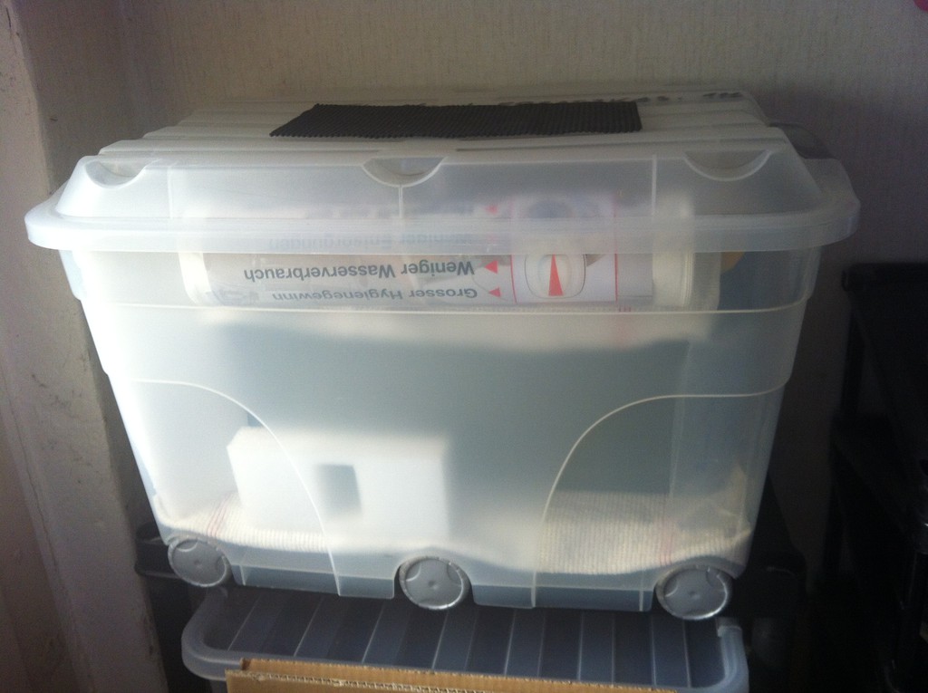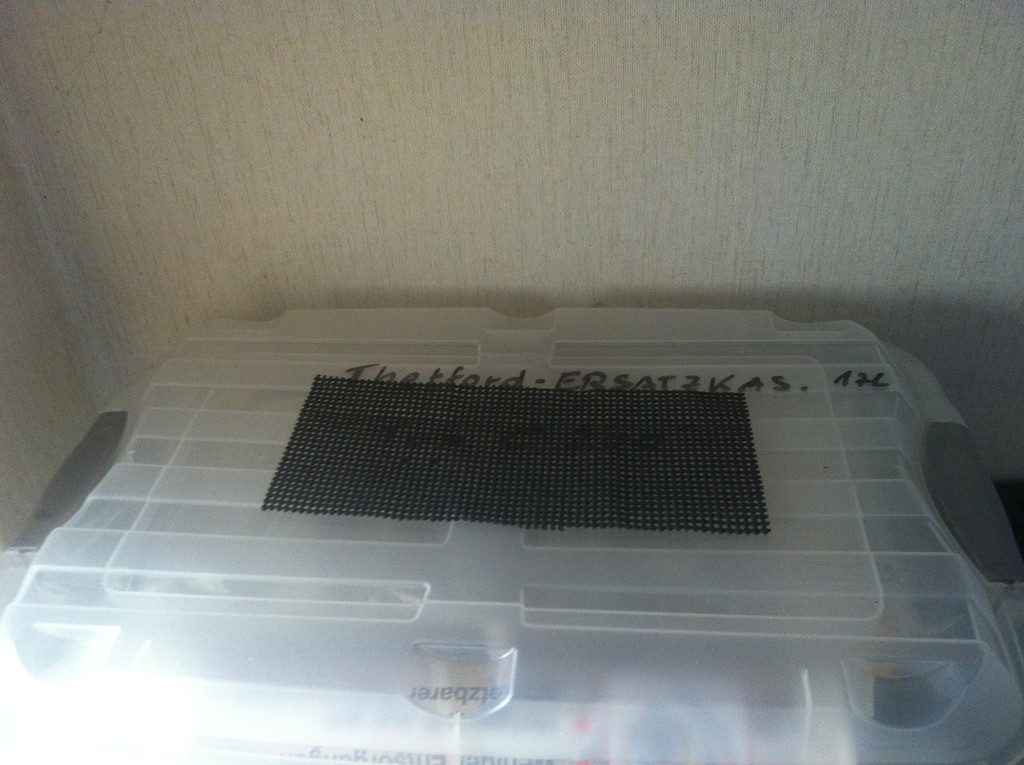 Unsere Variante (siehe oben) sind "Sichtlagerkästen" von Auer : --> Link Die gibt´s in unterschiedlichen Größen, mit und ohne Deckel. Also die Kassette abmessen, richtige Box raussuchen ... :) "Unsere Version" für 2 Reservekassetten sieht so aus : ![]() |