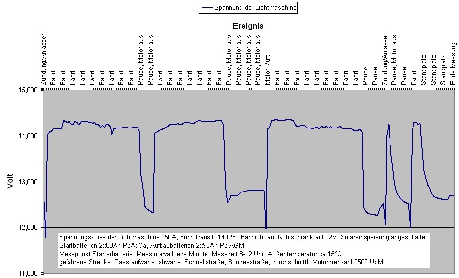 Bist du da ganz sicher?. Ich bezweifle, dass du ab Werk eine Ca/Ca Batterie eingebaut hast. Es ist bestimmt eine Pb/Ag/Ca- Batterie. Die Ford-Lima hat auch keine Ladekennlinie, sie lädt mit ca. 14,2-14,3V (je nachdem wo man misst) In bestimmten Zuständen der Starterbatterie kann die Spannung durch Erhöhung der Motordrehzahl auch mal auf 14,4V steigen. Auf 14,7V kommt man nur mit Zusatzlader (Solarregler). Ich habe mal zur Dokumentation meine Messkurve (Transit, BJ 2007, 2x PB/Ag/Ca a 60 Ah) eine mehrstündigen Urlaubsfahrt angehängt. ![]() Andreas Nochmal ne andere frage. Brauche ich für ein panel eine dachdurchführung für ein oder zwei Kabel (+,-)? Habe übers Wochenende auf einem stellplatz mir die Anlagen von anderen angesehen und bin bisher zu dem Entschluss gekommen: 100w mono Vier ecken Halterung Dachdurchfuhrung 100w akku 10A laderegler. Ach und noch ne frage. Ich habe noch caravankleber. Damit kann man die Halterungen nicht aufkleben oder? .