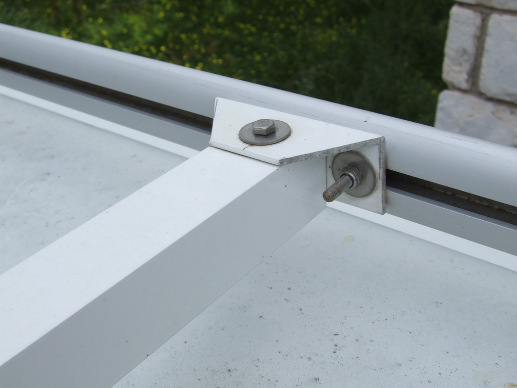 die Verbindung zur Reling ist ein Aluwinkelprofil 40 x 40 x 3mm. Da bei meiner Reling die Oeffnung zum einfuehren von T-Nutensteinen fehlt, habe ich die Reling einfach durchgebohrt. Niro-Schrauben, Schraubenkopf aussen, selbssicherden Mutter innen. Etwas rustikal aber wirkungsvoll.