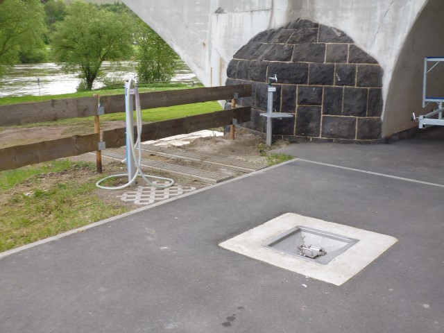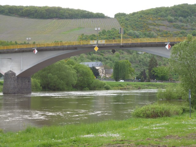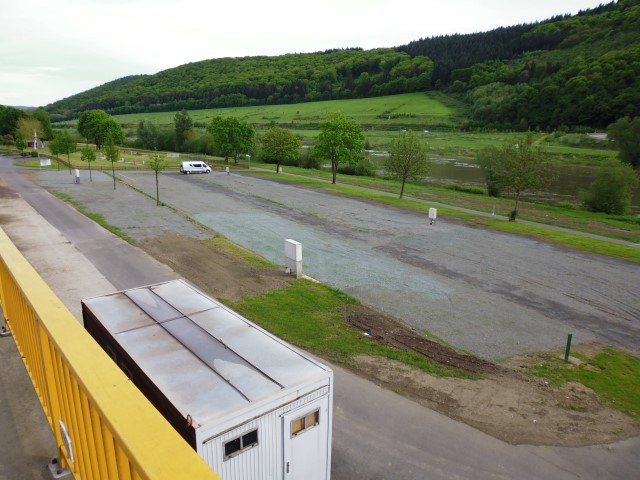 Der Platz liegt unmittelbar an der Bundesstrasse, gleich neben und unter der Moselbruecke.