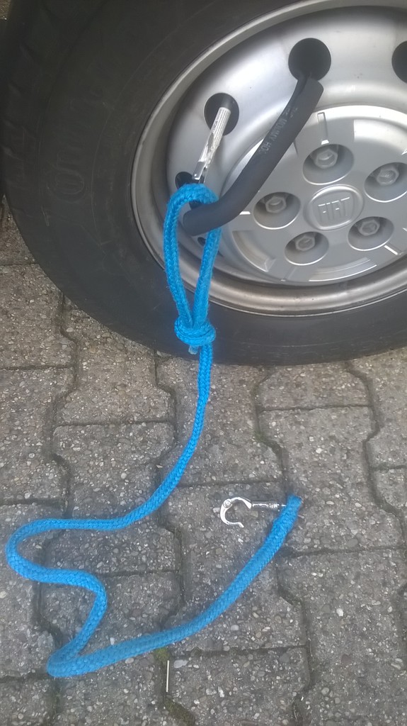 Unseren stake out komt von --> Link solte auch verkaufer in Deutsland haben Und bei --> Link Andrea sprecht Deutsch und wohnt nahe Passau Die platte von Andreas ,geht auch gut mitt ein/zwei hund(en) Wir haben seit vielen Jahren Unterwegssein mit unseren Labbies (Körpergewicht je Hund zw. 25-30kg) mit den Bodenheringen sehr gute Erfahrungen gemacht. Man muss sie allerdings wirklich bis zum Ende in den Boden drehen und natürlich den Boden entsprechend dafür aussuchen. Sand, o.ä. geht natürlich nicht. Da hilft dann eher ein stabiler Zaunpfahl, ein Baum, Busch oder ähnliches in der Nähe... Am Womo selbst würde ich keinen Hund anbinden - höchstens wie schon gesagt unterm Womo an geeigneter Stelle. :ja: Wie versprochen, hier das Foto meines Prototypen. Massiver V2A Stahl, sauber verschweißt und ich denke mal, selbst ein Tibet Mastif kriegt den nicht verbogen. ![]() Wer Interesse hat, mein Kumpel will dafür 14 Euro (etwa 8.--Euro davon sind Material) , zuzüglich Versandkosten. Meine Lösung für 5 € ![]() Das ist ja mal ne tolle Lösung ! Muss ich halt immer auf Keile fahren. :lol: Nein im Ernst, tolle Idee. Wir brauchen keine Öse oder so, unser Hund bleibt da wo er ist auch ohne Leine ;D es ist ein Deutscher Wachtelhund 8) Berni57